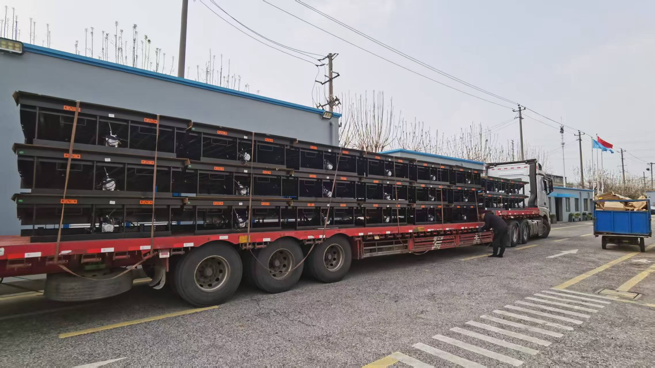 A dokkkiegyenlítők nehéz acélszerkezetek, ezért a szállítás során megerősített keretekkel rögzítjük őket. Ez megakadályozza a mozgást és védi a szerkezetet a deformációtól.